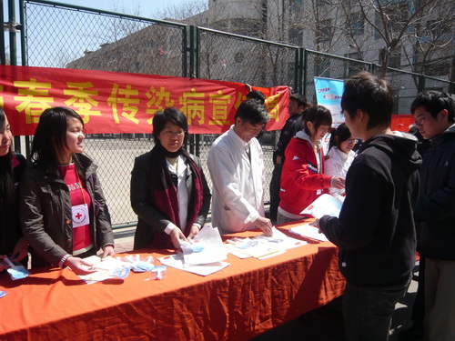 根据市教委、市卫生局通知精神, 4 月1 日中午,校医院预防科与校红十字会学生在排球场和南区举办了以“预防春季传染病,对疾病说拜拜!”为主题的预防春季传染病活动,在全校师生员工中普及传染病防治知识,达到提高自我防护意识,培养良好的卫生习惯,降低我校传染病发病与传播的目的。校医院杨学谦院长到活动现场进行了指导。
