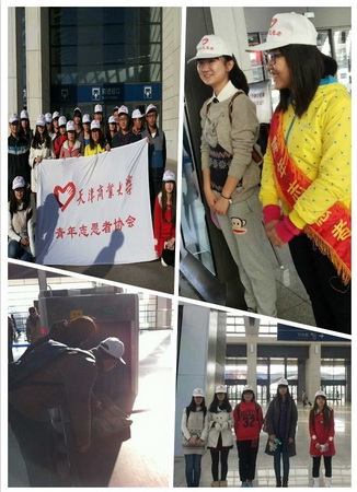 12 月 5 日是国际志愿者日,为了宣传志愿者精神,校青年志愿者协会积极响应天津市政府的号召,前往天津西站进行志愿疏通和站点维护。天津西站自 2011 年开通运营以来,客流量逐渐增多,站点的服务需求逐渐增加,为了配合西站工作要求,我校志愿者承担起安检督查、旅客的引导、进站口栏杆的清扫工作。志愿者工作认真,服务负责到位,受到西站和旅客的一致认可。