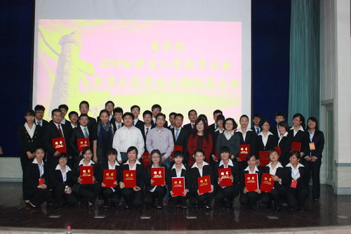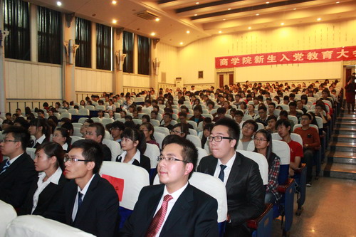 为引导2013 级新生志存高远、坚定理想,积极靠拢党组织,商学院在 9 月份各学生党支部分别为新生进行入党教育的基础上,于 10 月 9 日下午在学术交流中心举行了主题为“凝聚党旗下,理想在心中”的新生入党教育暨第六届党建干部换届大会。院 党委副书记翟云锋、学工办主任赵欣、辅导员穆怀放、孙雅楠出席会议。学院 20 个学生党支部的书记、院党建办主要干部及 2013 级新生近 500 人参加大会。会议 由学工办副主任曹静主持。