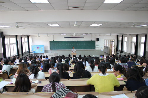 5 月21 日下午,商学院党委副书记翟云锋、学工办副主任曹静在阶五为学院全体毕业生党员上党课。毕业班学生党支部书记、学生党员、党建工作办公室学生干部近 300 人参加。