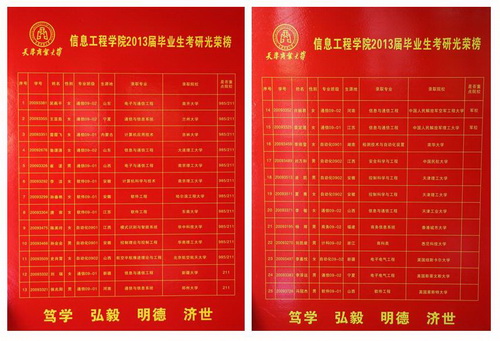 5月29日 ,信息工程学院在信息交流中心一楼推出 2013 届毕业生考研光荣榜。