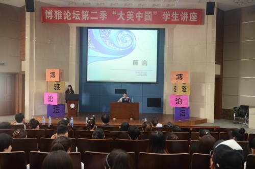 本次讲座由刘玉鑫、路国旌、彭策三名同学担任主讲,他们围绕 “ 大美中国 ” 这一主题,分别从 “ 第一夫人出访、建筑色彩、魅力四川 ” 三方面来阐述自己心中的大美中国。刘玉鑫同学的 “ 第一夫人出访 ” 从彭丽媛同志的行为举止、服饰搭配、国际影响三个角度展示了设计为生活带来的色彩,展示了 “ 大美中国 ” 之外交美;路国旌同学的 “ 建筑色彩 ” ,通过对故宫、布达拉宫、苏州园林等不同风格建筑的讲述,带领同学们走近建筑的世界,感受建筑的魅力,他的讲述脉络清晰,注重知识的深度,展示了 “ 大美中国 ” 之建筑美;彭策同学的 “ 魅力四川 ” ,由“雅安地震”继而引出雅安、成都、九寨沟地方山清水秀、引人入胜的风景,用朴实真诚的语言,展示了“大美中国”之风景美。