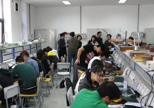 在考察工程教学实习训练中心时,我校考察人员实地参观了电子电工领域教学实训课堂,认真观摩了该校学生的实训过程,并于师生亲切交流,了解师生关于教学实训方面的情况。