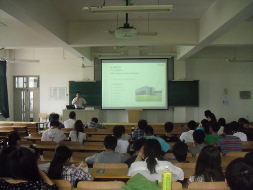 5 月17 日 ,在以“涡旋压缩机并联技术”为主题的讲座上,丹佛斯天津有限公司人力资源主管任雅莲、亚太培训中心总经理沙陆从丹佛斯企业背景、丹佛斯产品系列、产品技术应用商业领域几个方面进行详细的讲解,让同学们系统了解了涡旋压缩机并联技术的原理和应用前景。