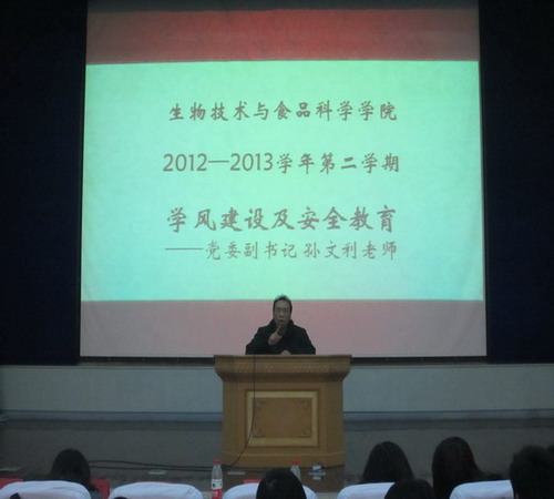3 月 2 0 日上午,生物技术与食品科学学院在学院会议室召开了班主任工作会议,就进一步强化班主任的班级管理指导职能,提升班级管理水平进行了工作安排,学院党委书记鲁晓翔和全体班主任们参加了会议。会议由学院党委副书记孙文利主持。孙老师首先通报了本学期开学以来学生报到注册及上课情况、各年级各班级工作学习生活状态以及个别案例引发的几种现象,并结合工作实际,提示班主任老师在学生身心安全、财产安全、交通安全、饮食安全等方面加强教育管理指导,维护校园安全稳定。鲁老师对学院上学期学生工作取得的成绩给予了肯定,明确了本学期学工工作的任务和目标,要求全体班主任老师加强对班级工作推动能力,积极学习贯彻好党的十八大精神,学习好两会精神,提升政治意识、大局意识,努力把握好发展方向。同时强调要提高学生安全防范意识,加强班干部队伍建设和使用,促进学生全面健康成长。