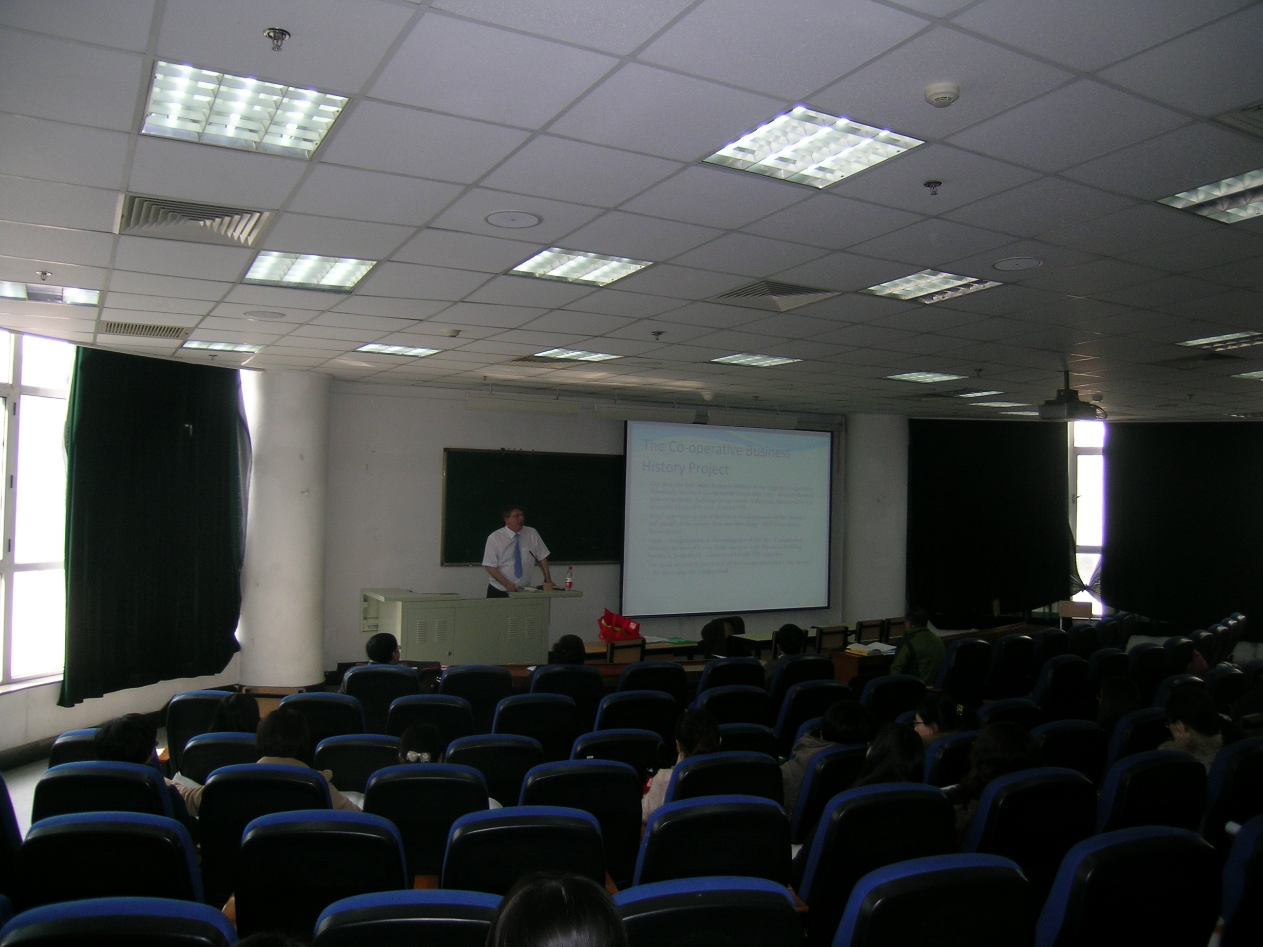 3 月 27 日下午,英国利物浦约翰摩尔斯大学 Webster 博士应邀来外国语学院做学术讲座,讲座主题为“合作社的发展历程及对英国社会的影响”。 Webster 博士采用纵向和横向相结合的方式叙述了合作社产生的背景、发展历程和远景。本次讲座由外国语学院副院长王永祥主持,与会人员包括外国语学院全体教师和研究生。