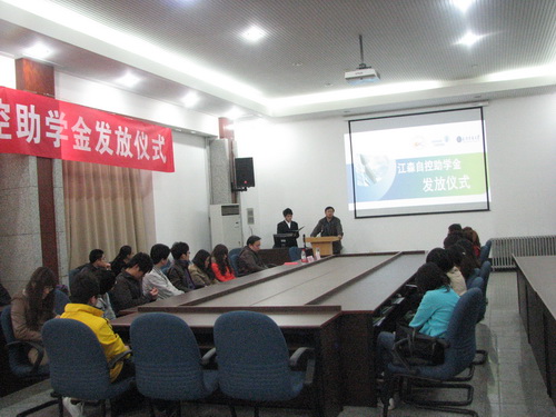 4 月 3 日 ,机械工程学院在新实验楼会议室举行江森自控助学金颁奖仪式。机械工程学院院长申江、党委副书记刘振强为 21 名获奖学生颁发奖金。