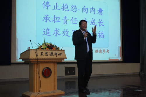 11 月7 日下午, 商学院承办的天津商业大学第53 期企业家论坛暨商学院学风建设月开幕式在学术交流中心隆重举行。清华大学职业经理训练中心特聘教授、北京大学高级总裁班特聘教授、北京家和业咨询有限公司董事长、天津明理企业管理咨询有限公司董事长程社明先生做了“从优秀学生到合格职业人”的主题报告。商学院党委副书记翟云锋主持了活动。