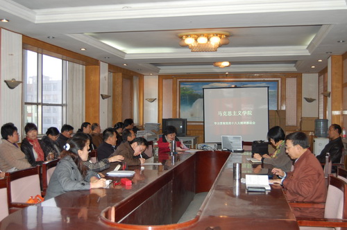 为深入学习贯彻党的十八大精神,马克思主义学院于 11 月 14 下午在 408 会议室召开了教职工学习贯彻党的十八大精神推动。学院党总支书记、院长初明利,副院长张静和全体教职员工出席了此次会议。会议由党总支书记、院长初明利主持。