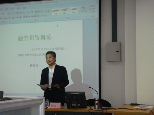 11 月 21 日下午,由“天津商业大学中国融资租赁研究与教育中心”承办的天津商业大学第54 期企业家论坛在图书馆举行。中国国际商务租赁委员会主席、天津市租赁行业协会会长杨海田教授作了主题为“融资租赁市场发展与就业趋势”的学术报告。报告会由经济研究所副所长王树春教授主持。