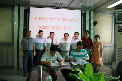 8 月 21 日上午,公共管理学院与今晚传媒集团《渤海早报》传媒(天津)股份有限公司在我校多功能会议厅正式举行战略合作签约仪式。《渤海早报》总经理刘延军、《渤海早报》会展事业部经理刘晓亮,校党委宣传部部长张克明、教务处副处长曹军、公共管理学院党委书记白洪文、副院长李增田以及会展专业部分教师参加了签约仪式。