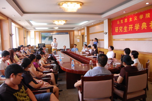 在开学典礼上,张静副院长代表全院师生对 2012 级研究生新生的到来表示热烈的欢迎和祝贺,向新同学介绍了出席典礼的各位导师,新同学们进行了自我介绍。马克思主义中国化专业学科带头人柴观珍老师以生动的语言、耐人寻味的哲理小故事寄语新生,希望他们在研究生学习期间善于积累、勤于思考,合理规划自己的人生道路。学院研究生会主席李岩作为老生代表以自己的研究生经历激励学弟学妹们不断探索专业知识、丰富内涵、完善自身。 2012 级新生杨镓竣作为新生代表对学校给予的细致、周到的服务,对入校后老师们的关怀表示深深的谢意。最后,初明利院长向 2012 级新生介绍了马克思主义学院的概况和学科发展目标,解读了学院“和谐、创新、精品”的办学方针,强调要善于运用马克思主义理论、观点和方法来分析解决问题,希望新生们能以饱满的状态投入到新的学习生活中去。