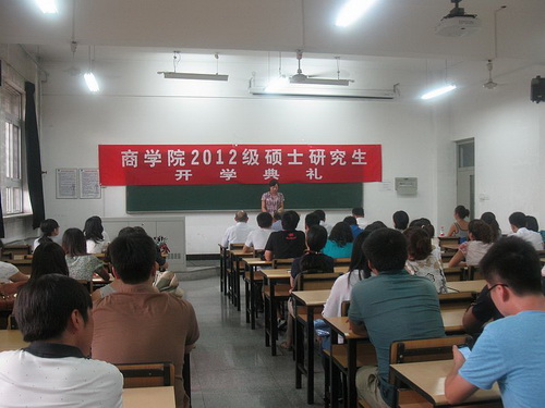8 月 29 日,商学院在 3 号教学楼 114 教室举行了庄重而热烈的开学典礼。校长助理、商学院院长寇小萱,党委书记李新锁,副院长王庆生,院党委副书记翟云锋与 90 余名硕士研究生齐聚一堂,正式拉开了 2012 级硕士研究生新一阶段学习生活的序幕。开学典礼由商学院副院长王庆主持。