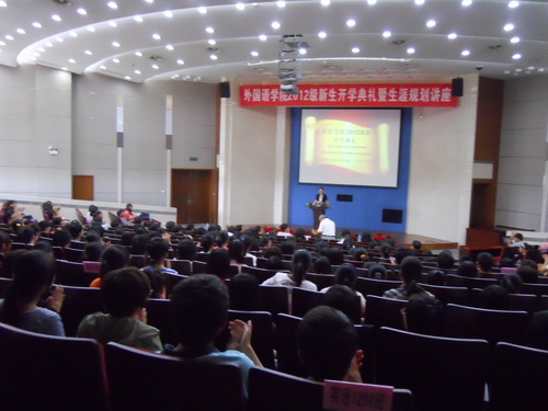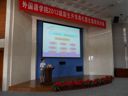 9 月 12 日 下午,外国语学院 2012 级新生开学典礼暨学业生涯规划讲座在图书馆三楼国际报告厅举行。学院党总支书记张淑敏、副院长王永祥、副院长王占斌、副书记骆媛、孟庆生教授和全体教师出席, 288 名新生参加了开学典礼。开学典礼由副书记骆媛主持。