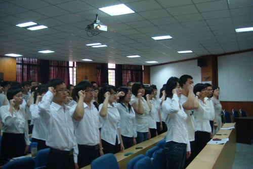 辅导员 王欣欣首先致辞,表达了对毕业生党员的祝贺与期许,对毕业班党员在校最后两周多的工作与学习提出了希望,接着,毕业班 106 名党员在学生党支部书记张雪明的带领下重温入党誓词,向党旗庄严宣誓。然后,毕业班党员代表财政 082 班的赵元坤同志代表党员发言,表明了牢记党员使命,为学校、为社会贡献力量的决心。最后,副书记张玉娟对广大毕业生党员提出了五点希望:一是要时刻牢记党的宗旨与义务,从人生追求上把我们的生命融入社会建设,融入到党的事业中去。二是把先进性的目标与自己的本职工作紧密地结合起来。三是加强理论学习,面临教育发展最迅速的时代,把业务学习与政治认识的提升相结合。四要树立自身良好威信,树立威信的过程就是发挥模范作用的过程,党员要用好的形象、好的思想、好的作风、好的工作成绩,做好表率,走在群众的前面。