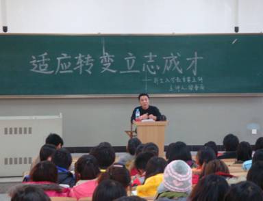 梁老师首先介绍了我院学生干部队伍和特色专业社团的情况。,以自己的亲身经历摆事实、举例子。指出在大学阶段的人生转折点是非常重要的阶段,要尽快适应转变,把握人生,立志成才。针对大一新生的特别情况,梁老师提出急需调整、适应的六大转变。