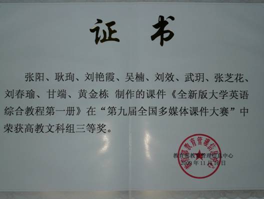 大学外语教学部全新版教学改革小组成员张阳 、耿珣 、吴楠、甘端、张芝花、刘艳霞、刘效、刘春瑜、武玥制作的课件《全新版大学综合教程第一册》和《全新版大学综合教程第二册》在“第九届全国多媒体课件大赛”中分别荣获高教文科组三等奖和优秀奖。这套多媒体课件是配合《全新版大学英语》综合教程教学设计而成的,课件中的练习都围绕教材中出现并要求掌握的语言点及与主题有关的语言文化知识展开。其设计基于现代英语教学法及二语习得规律,用简洁明快,新颖活泼的方式,试图解决传统教学模式中,学生的信息接受量小、方式单一,学习兴趣不高,教学效率低下等问题。目的是希望打破传统的以教师为中心的教学方法,利用新技术培养学生独立思考和学习的能力。