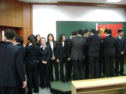 国贸系 学生党支部书记孙晶宣读了新发展的党员名单,往届学生党员为新发展党员佩戴党徽,在学生党员代表香锦斌同学领誓下,新发展党员高举右手,庄严宣誓, 表达了自己对党的忠诚,对共产主义信仰的坚定决心。