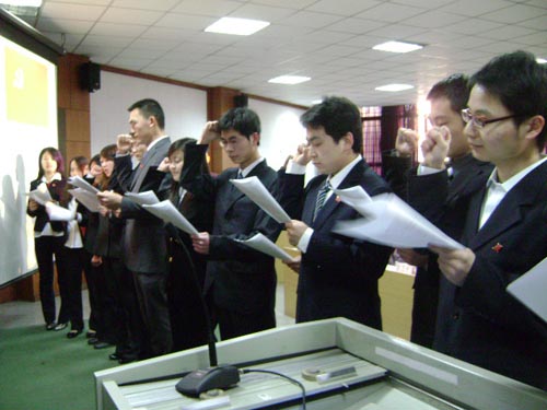 12 月 16 日 下午,庄严的国歌声响彻教学楼 3-110 教室,经济学院党总支在这里隆重举行 2009 年新发展学生党员集体宣誓仪式。 校党委组织员张宗安老师,经济学院党总支张淑敏副书记,经济学院各系辅导员以及全院学生党员和积极分子 200 余人参加了宣誓仪式, 25 名新发展党员庄严宣誓。