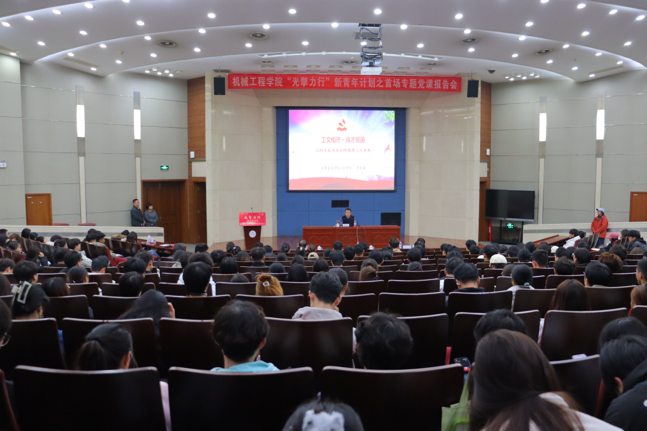 10月30日下午,机械工程学院在图书馆国际报告厅举行“光擎力行”新青年计划品牌系列活动首场专题党课报告会。天津音乐学院人文学院党总支书记罗亦南应邀讲授专题党课,学院党委书记张莹、校关工委秘书长刘会洪出席报告会,学院师生党员、发展对象、入党积极分子等300余人参加。