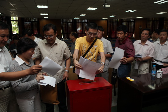 全体与会代表在认真听取学校学习实践活动开展情况的通报后,以无记名投票方式进行了群众满意度测评。