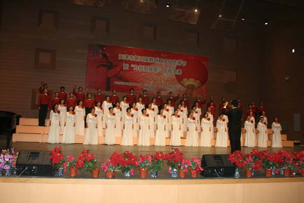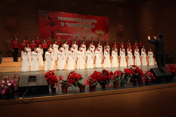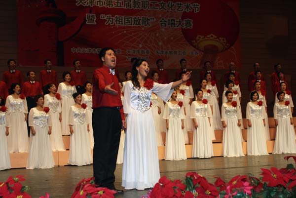 在喜迎国庆 60 周年到来之际,由天津市教育工委、教委、教育工会联合举办的“为祖国放歌”教职工合唱大赛于 9 月 12 日 — 9 月 13 日 在天津师范大学音乐厅举行。我校由 60 名教职工组成的合唱团,在校领导的高度重视下,经过近 1 个月的紧张排练,代表全校师生参加了大赛。在强手如林的 24 个高校代表队中我校以总成绩第 7 名获得二等奖。在比赛中教师们以饱满的热情,激昂的斗志,用歌曲《祖国颂》和《青春舞曲》把天商师生祝福祖国 60 年华诞的拳拳挚诚之心献给了祖国,献给了人民,以优异成绩为学校争得了荣誉。