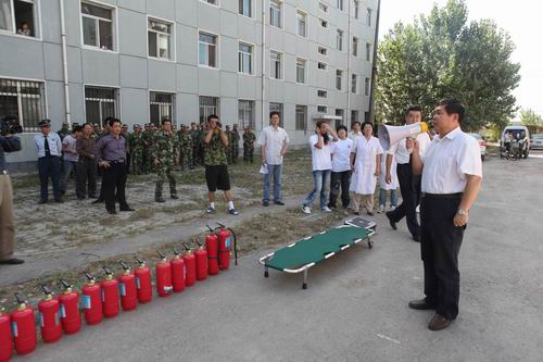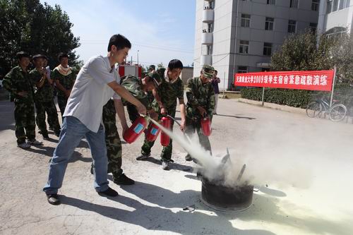 公安消防 43 中队出动一部消防车,现场进行了灭火表演;北辰消防支队领导现场讲解了灭火器的使用方法并实际操作示范; 2009 级学生、宿舍管理人员、军训教官,亲身体验用灭火器灭火。