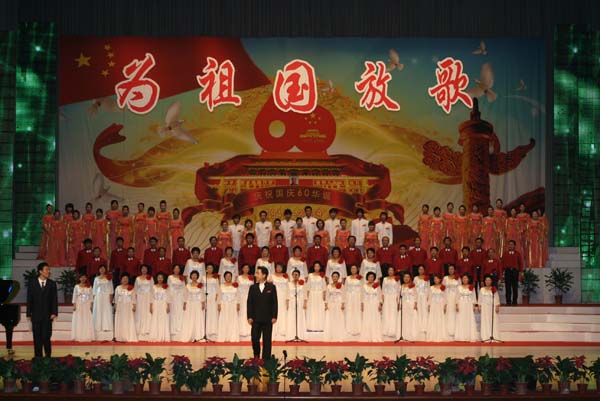 来自本市高校和普教的 3500 名教职工欢聚一堂,载歌载舞,用歌声和舞姿追思革命先烈为新中国的诞生英勇奋斗的精神;讴歌社会主义改革开放 30 年来祖国的巨变和所取得的丰功伟绩;祝福祖国繁荣昌盛人民富裕安康。演出由《序曲》、《峥嵘岁月》、《时代颂歌》、《放歌祖国》四部分组成,我校由 100 人组成的师生合唱团用《青春舞曲》表达放歌祖国的喜悦心情。整台晚会色彩绚丽、品位高雅、阵容强大、气势恢宏,晚会在全场齐唱《歌唱祖国》的歌曲声中闭幕。