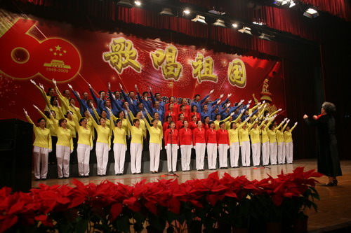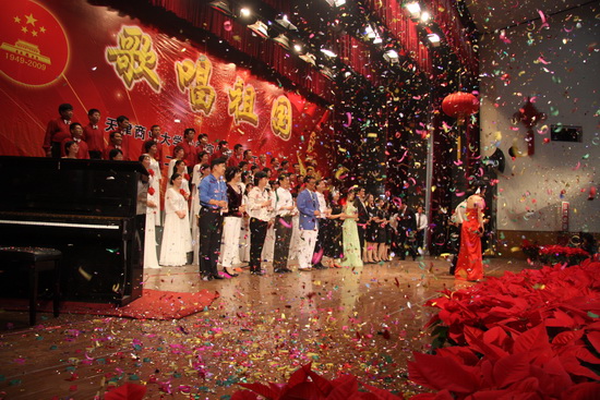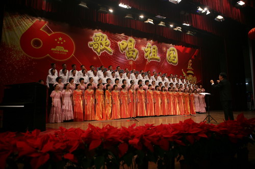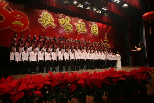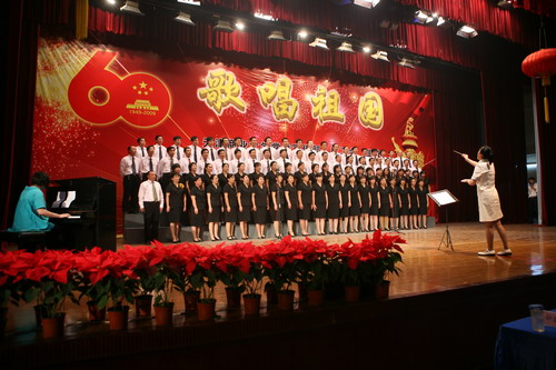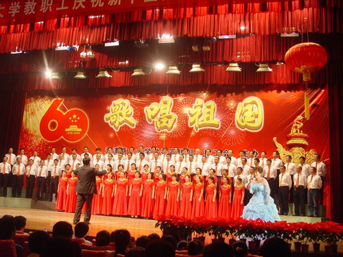 9 月 30 日 下午,由我校党委宣传部、工会主办的教职工庆祝新中国成立 60 周年歌咏比赛在科学会堂隆重举行。校党委书记陈学奇、副书记杨万义、史习红、副校长魏胤亭、马三津等领导出席大会。