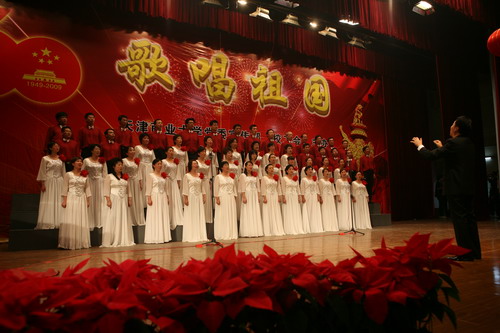在新中国60华诞到来之际举行全校教职工歌咏比赛,既是献给祖国母亲的一份祝福,更激发了广大教职工的爱国热情,把满腔热忱化作投身教学、科研和管理工作的实际行动,为学校的发展建设,在各自的工作岗位上努力贡献自己的一份热情、一份力量。服务天津经济社会发展,以优异的业绩回报伟大的祖国。