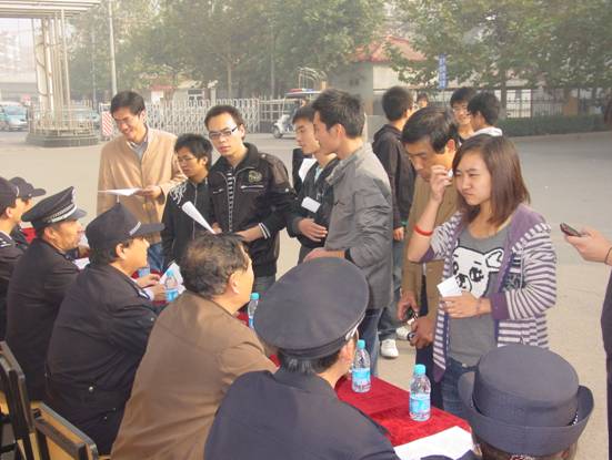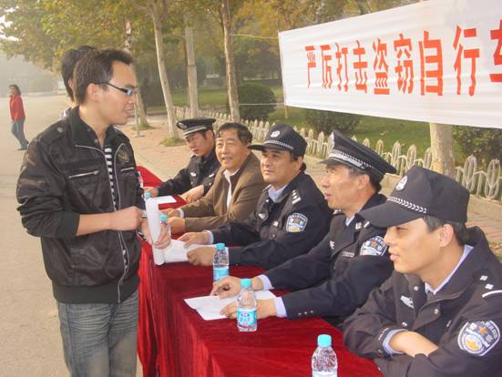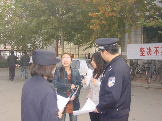 10 月 29 日 下午,天津市公安局、北辰分局和佳荣里派出所,派出 10 名警官,到我校开展打击盗窃自行车违法犯罪活动。副校长马三津和民警一起进行宣传并现场解答师生提出的自行车防盗问题。