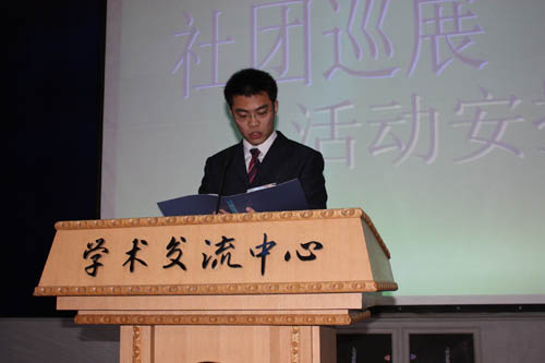 校社团联合会主席周晓宁致开幕词。她表示,学校社团有利于同学们丰富生活、完善人格,为同学们展示自我提供平台,希望校园社团能越办越好。开幕式上,社团联合会执行主席杨阳介绍了本届社团巡展活动的安排:在 11 月至 12 月,各个社团的精彩活动将轮番上阵,模拟法庭、炒股大赛、职场沙龙、街舞魔术……冬日的校园文化生活将会丰富多彩。社团代表校辩论社社长孙傲发言,他表示,社团活动正努力向知识性、学术性、趣味性、思想性靠拢,社团也在走向规范化、特色化、品质化。南开大学社团联合会常务副主席李妍作为嘉宾发言,她肯定了我校社团的发展,希望全市各兄弟院校社团能够相互帮助,加强交流与合作。同学们观看了我校 90 多个社团在过去一年中的精彩活动 DV 展示。