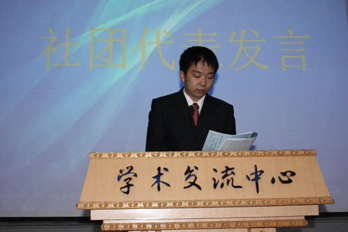 校党委副书记杨万义讲话。他肯定了我校一些社团取得的骄人成绩,指出我校社团作为培养学生兴趣爱好、繁荣校园文化生活的第二课堂,已经成为大学生丰富校园生活、参与学校活动、延伸求知领域、扩大交往范围的一种重要方式,各社团以自身特有的思想性、艺术性、知识性、趣味性、多样性,吸引着广大青年学生积极参与。他还向广大同学提出三点希望:一是要不断办好社团活动,提高活动的覆盖面,吸引更多同学参加到社团里来;二是要在社团活动设计上下功夫,提高社团活动质量;三是社团活动要不断创新,同时要积极把社团活动与社会实践活动结合起来。