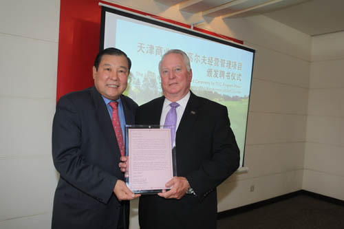 天津市人大常委会副主任、高协主席王述祖主任指出:天津商业大学的 FIU 酒店管理合作项目办出了特色,取得了辉煌的成绩,毕业生深受业界欢迎,这个项目堪称中国国际化办学的成功典范。王述祖主任对 FIU 酒店管理学院院长 JOE WEST 博士、 FIU 中国项目主任卢朋博士在合作办学中的贡献表示感谢!称赞 JOE 是中美教育合作的开拓者。他在肯定中美酒店专业合作项目成绩的同时希望:在高尔夫经营管理方向上继续两校间友好合作。他强调:随着高尔夫运动项目正式列入 2016 年奥运会,必将推动全球高尔夫产业的快速发展,培养高尔夫产业经营管理人才是社会所急需。要以首届 20 人的高尔夫班为契机,探索高尔夫经营管理人才培养的可行方案,培养出业界需要的优秀管理人才。