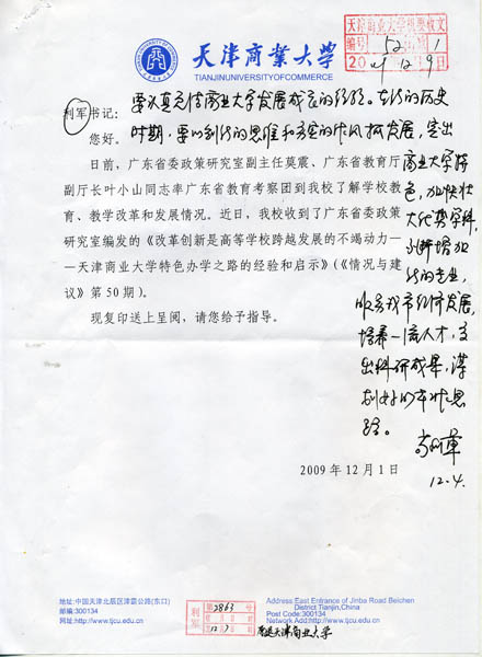 日前, 市委常委、市委教育工委书记苟利军对我校今后的工作作出重要批示。此批示是在广东省委政策研究室副主任莫震、广东省教育厅副厅长叶小山同志率广东省教育考察团到我校了解学校教育、教学改革和发展情况后,形成了《改革创新是高等学校跨越发展的不竭动力—天津商业大学特色办学之路的经验和启示》的调研报告。苟利军书记阅后作出批示。