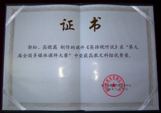近日,在 “ 第九届全国多媒体课件大赛 ” 中,外国语学院英语系讲师郭松和高晓茜制作的《英语视听说》多媒体课件荣获高教文科组优秀奖。教育部教育管理信息中心为此颁发了证书。