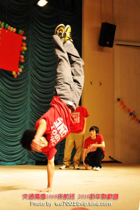 在交通广播1068夜航班组织的2010新年联欢会上我校大学生登台表演了街舞。