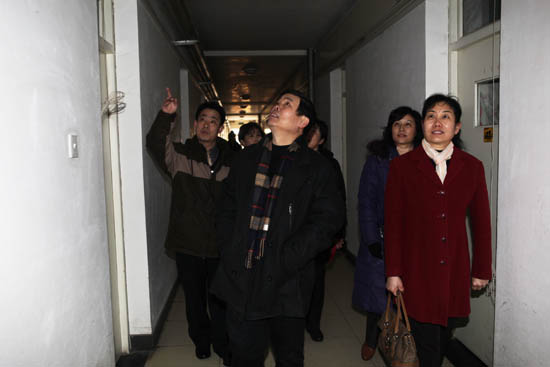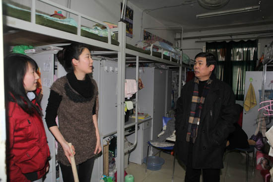 3 月1 日早 7 :40 ,校党委杨万义副书记率领学工部和各学院党总支分管学生工作的书记、副书记到学校南区芳园学生宿舍进行巡视,对宿舍室内温度、进出楼门刷卡设备运行情况和宿舍硬件设施进行了检查,对宿舍管理工作进行了调研指导,与宿舍管理人员和值班人员进行了交流。杨万义副书记要求各学院及相关部门高度关注学生返校后的思想、学习、生活情况,引导学生尽快进入学习状态,以饱满的热情投入到学习中。同时还要求各学院及相关部门,关注学生返校后学生宿舍安全卫生和饮食情况,加强学生宿舍的安全防范,提高学生的安全意识,加强宿舍管理的制度建设,各相关部门要相互支持、配合,为学生的学习生活提供周到的服务。