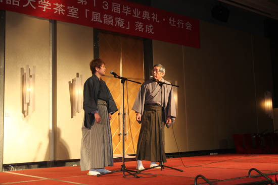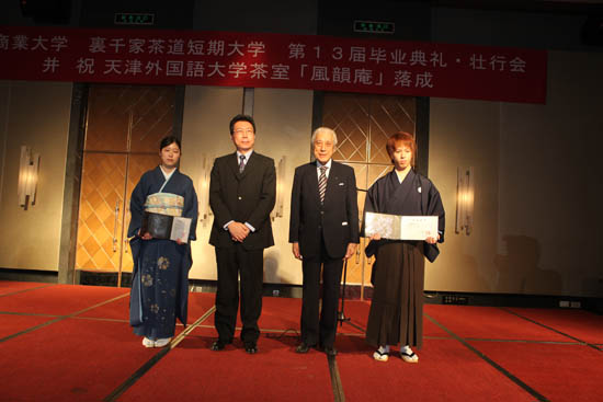 千玄室大宗匠先生在会上说,与天津商业大学合作十几年来培养了中日学生300 余人,在此,向为此项工作做出贡献的老师及工作人员表示诚挚感谢!大宗匠先生表示将继续以“一碗茶中出和平”的理念、为中日友好做出贡献。刘书瀚校长在毕业典礼上讲话,他高度赞扬了千玄室大宗匠先生对中日文化交流所作出的重要贡献,高度评价了茶道短期大学在推进我校国际化办学进程中的积极作用。