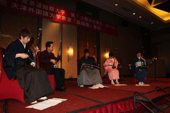 下午 5 : 30 ,我校里千家茶道短期大学第十三届日本留学生毕业典礼、送行会及天津外国语学院风韻庵茶室落成揭牌庆贺宴会在日航酒店隆重举行。天津市人民政府外事办公室副主任王树华、我校校长刘书瀚、天津外国语学院院长修刚、河西区区委副书记曲孝丽以及公安局出入境管理局副局长刘剑欣出席,中日双方相关人员 100 余人参加毕业典礼。