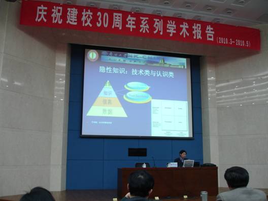 3 月 24 日 下午 2 : 00 ,庆祝我校建校 30 周年系列学术报告活动在图书馆三楼学术报告厅正式拉开帷幕。我国图书馆界知名学者、南开大学信息管理系主任、博士生导师柯平教授做了题为“关于知识管理前沿的十个问题”的首场学术报告。图书馆副馆长庞恩旭主持了报告会。我校科研处、学工部等有关领导以及有关二级学院师生 200 余人参加了报告会。