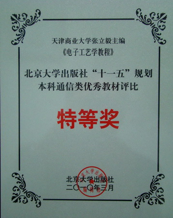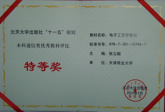 近日 ,在北京大学出版社召开的2010年度电气信息类优秀教材评奖修订会上,由我校信息工程学院院长张立毅教授主编的教材《电子工艺学教程》,获得北京大学出版社“十一五”规划本科通信类优秀教材评比特等奖。