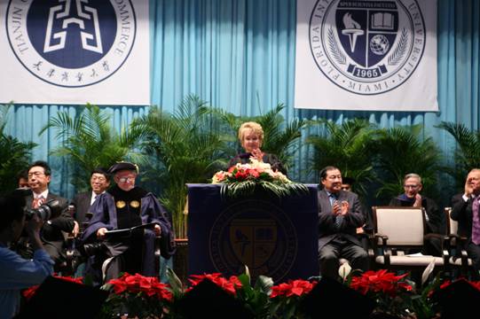 美国佛罗里达国际大学校长Mark B. Rosenberg在致辞中说,他很高兴能参加这次毕业典礼,并祝贺全体毕业生通过自身的努力拥有了参与国际竞争的资本。他充分肯定了我校酒店管理专业的人才培养模式,并表示FIU将与我校继续合作,进一步开办酒店硕士、探讨其他专业的合作项目、举办FIU天津美食节等活动。最后,他对毕业生提出了三点希望:以母校为荣、宣传母校、支持母校。