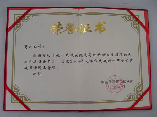 近日,在天津市统战理论研究优秀成果评选中,我校统战部李新锁、方雷的《统一战线为促进高校科学发展服务方式和途径研究》获得 2009 年优秀成果评选三等奖。