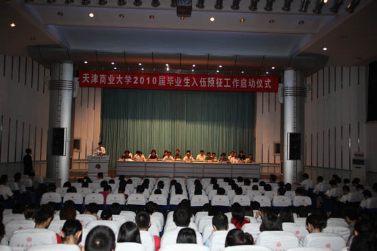 5 月 25 日 下午,“投身绿色军营 成就商界才俊”我校 2010 届毕业生入伍预征工作启动仪式在学术交流中心举行,校纪委书记路波,学工部部长贾青,校团委书记王罡,保卫处副处长杨洪涛、学生处副处长张捷,北辰区武装部副部长邹军,北辰区武装部军事科科长黄锦科,各学院分管学生工作的书记、副书记,全体辅导员以及 2010 届毕业生代表