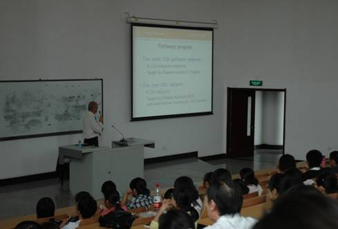 会谈结束后, Atkinson 博士为国际教育学院全体学生就项目运行及课程等问题做了详细的介绍,同学们积极提问,在课程、学业、交换生计划等问题上与 Atkinson 博士进行了交流。