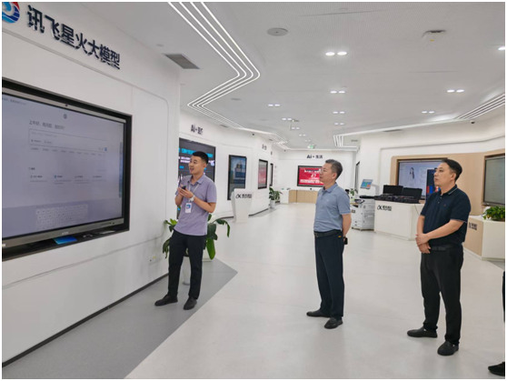 会前,余江一行参观了科大讯飞人工智能展示中心,了解公司发展历程,观摩了智能语音识别、人工智能等前沿技术在教育、医疗等领域的创新应用,现场体验了星火大模型、星火智慧黑板、星火教师助手演示。