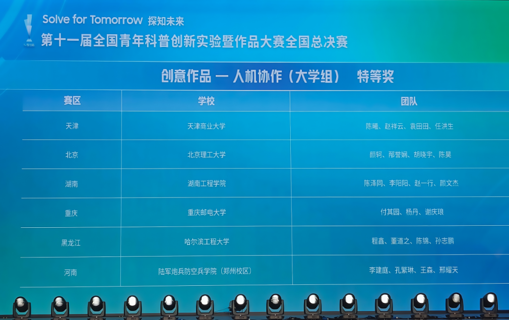 7月28日至31日,由中国科学技术协会主办的“第十一届全国青年科普创新实验暨作品大赛全国总决赛”在安徽省科学技术馆成功举办。由机械工程学院副院长常青、辅导员陈勇指导,智能制造工程专业2023级本科生陈曦,机械2023级硕士研究生赵祥云、袁田田以及信息与通信2023级硕士研究生任洪生组成的参赛团队,在创意作品——人机协作(大学组)赛项中荣获特等奖,为天津市代表队赢得了荣誉。