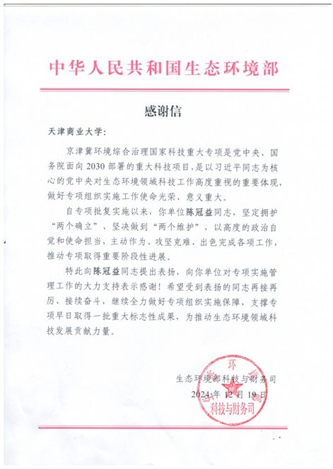 信中高度评价陈冠益教授以高度的政治意识、责任心和使命感,主动作为、攻坚克难,充分发扬了爱国、创新、求实、奉献、协同、育人的科学家精神,圆满完成了各项工作任务,展现出过硬的工作能力和务实的工作作风,为生态环境部做好京津冀重大专项实施提供了重要支撑,推动专项取得重要阶段性进展。