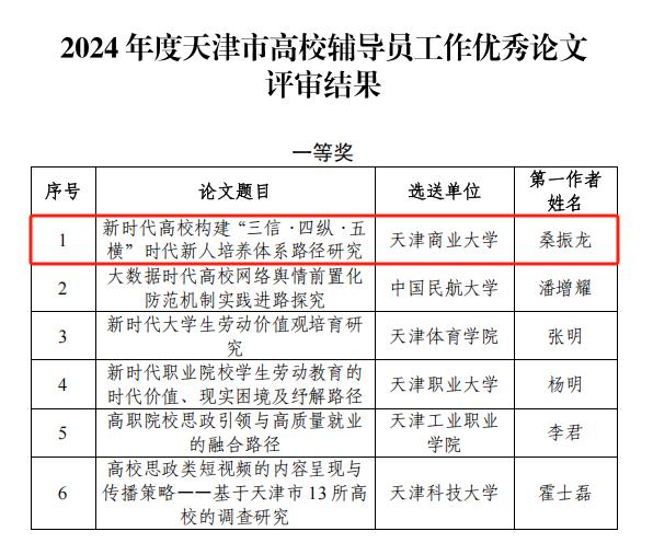 近日,市教育两委公布2024年度天津市高校辅导员工作优秀论文评审结果,经济学院桑振龙老师撰写《新时代高校构建“三信·四纵·五横”时代新人培养体系路径研究》论文获一等奖、理学院王素芳老师撰写《“IIV”大学生网络素养测量指标体系构建与培育路径研究》论文获三等奖。